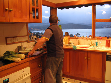 and here's dave, cooking. understandably distracted by the amazing view of the mountain from the kitchen.