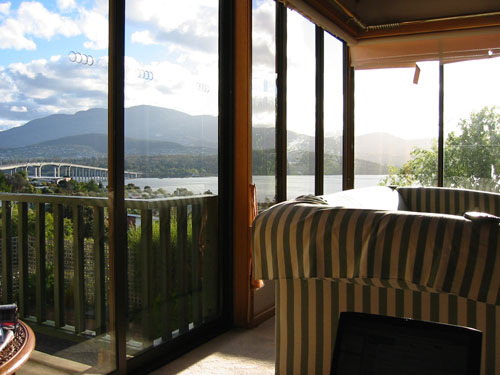 right now, though, i'm sitting in a pool of sunshine enjoying the view (hallooo mt wellington) and suckin up my new billy holiday cd. i've had a few pieces of lindt chocolate and a few potato chips (that song is really sticking in my head... is it slim and slam?), i've had a little dance with the squeeze in the loungeroom here, and i'm feeling shweet. here is photographic evidence.